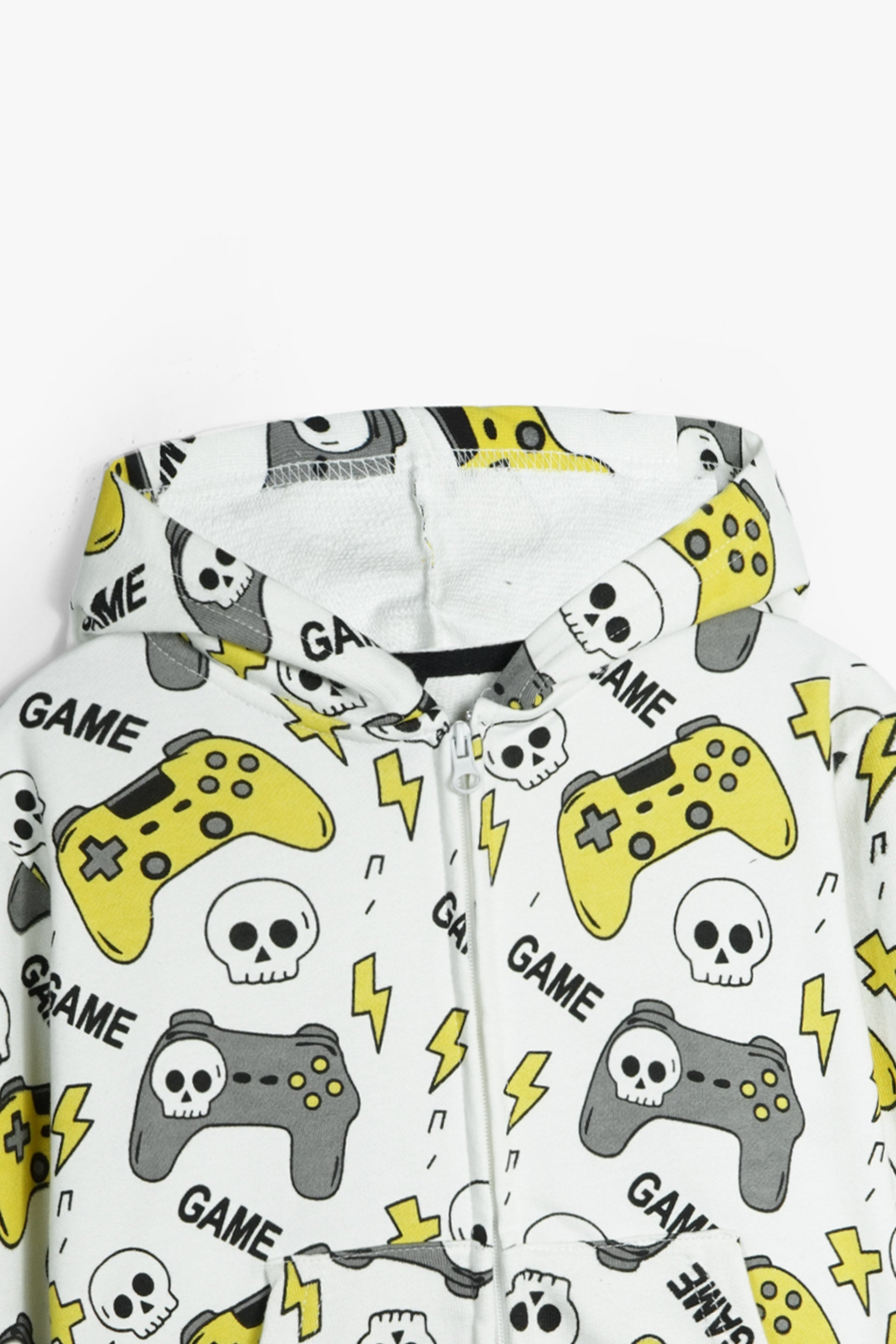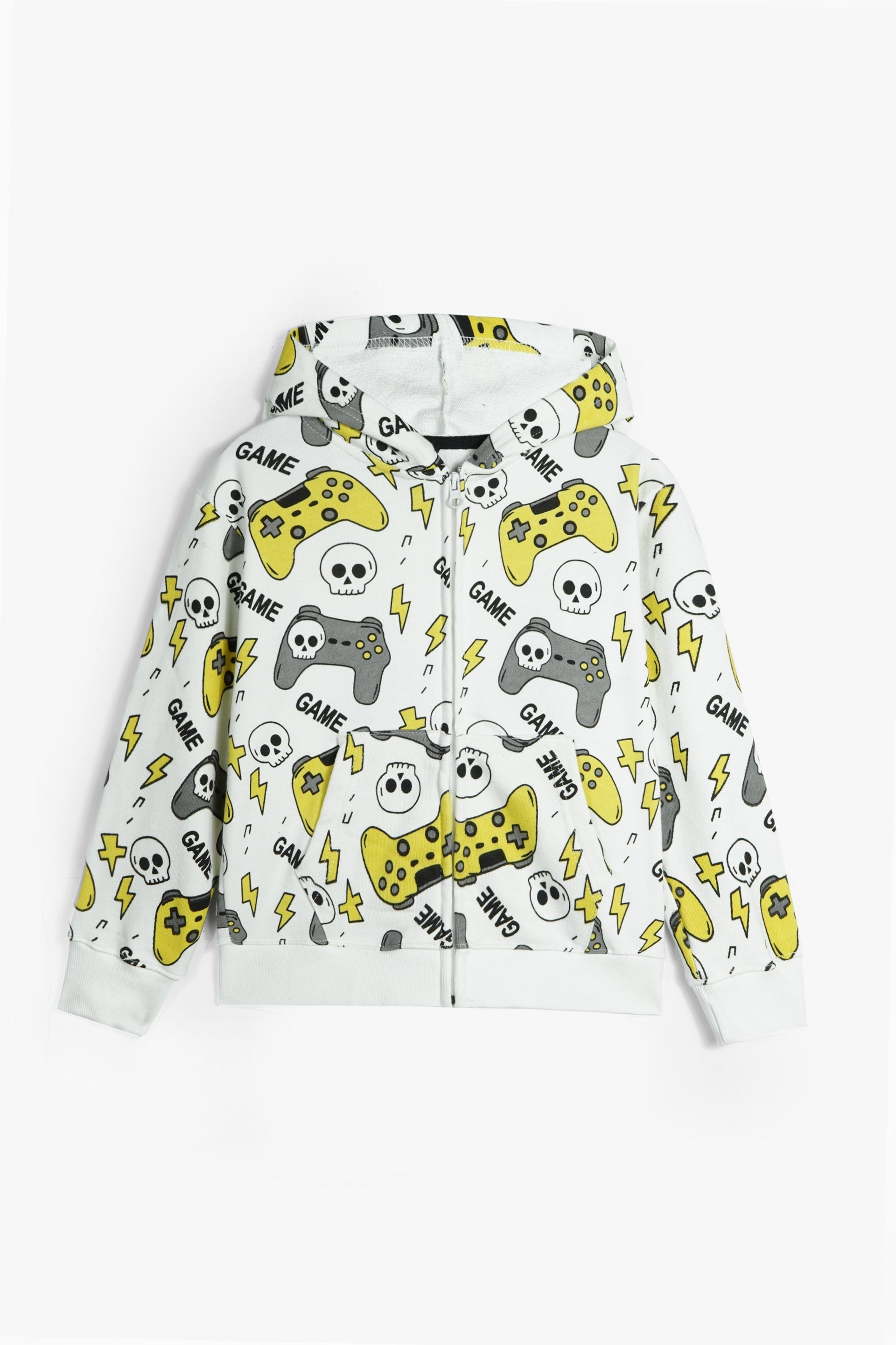Level up your child’s casual style with our Gaming Print Cotton Terry Hoodie, made from 100% premium cotton Terry for all-day comfort, breathability, and durability. Perfect for little gamers, this hoodie features an all-over gaming controller, skull, and lightning print in bold yellow, grey, and black for a fun and edgy look.