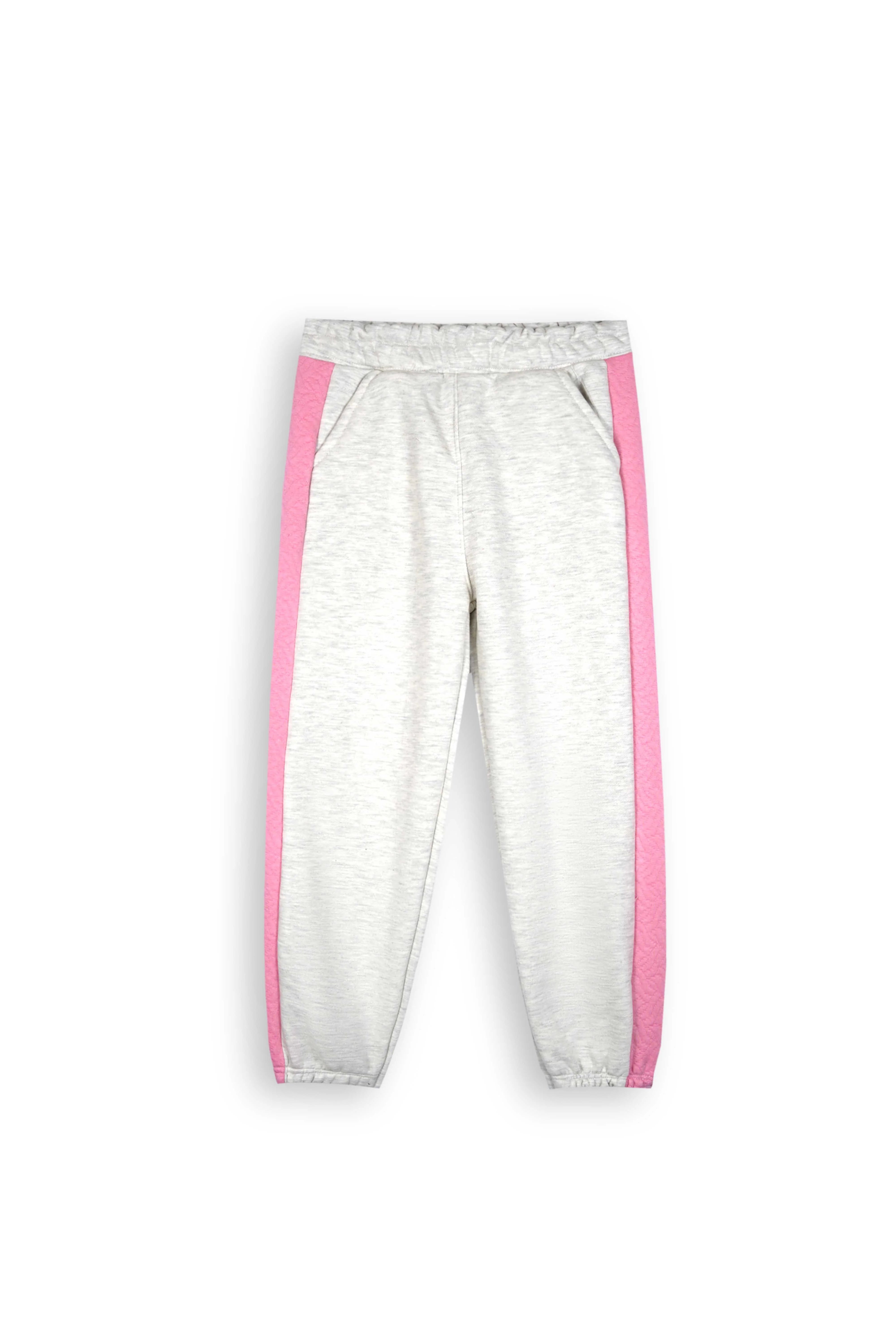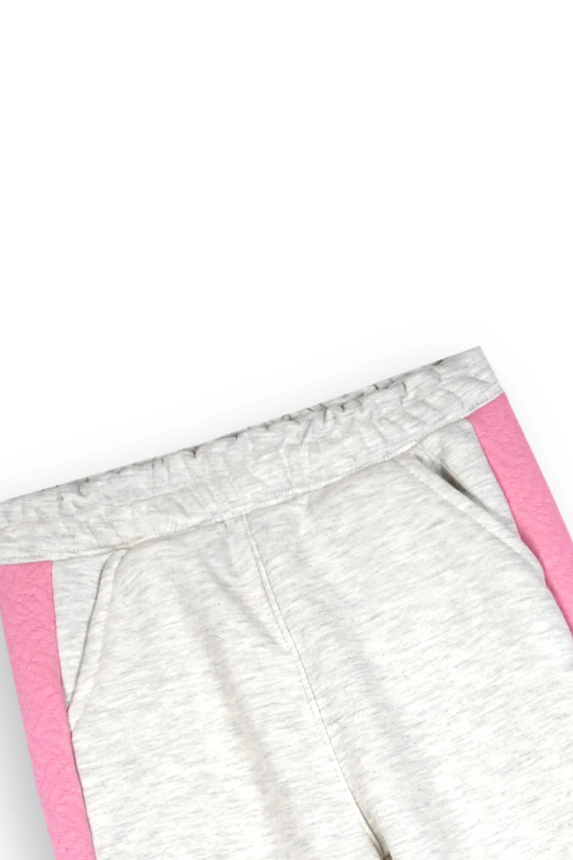 Stylish pink quilted fabric detailing on hoodie and trousers