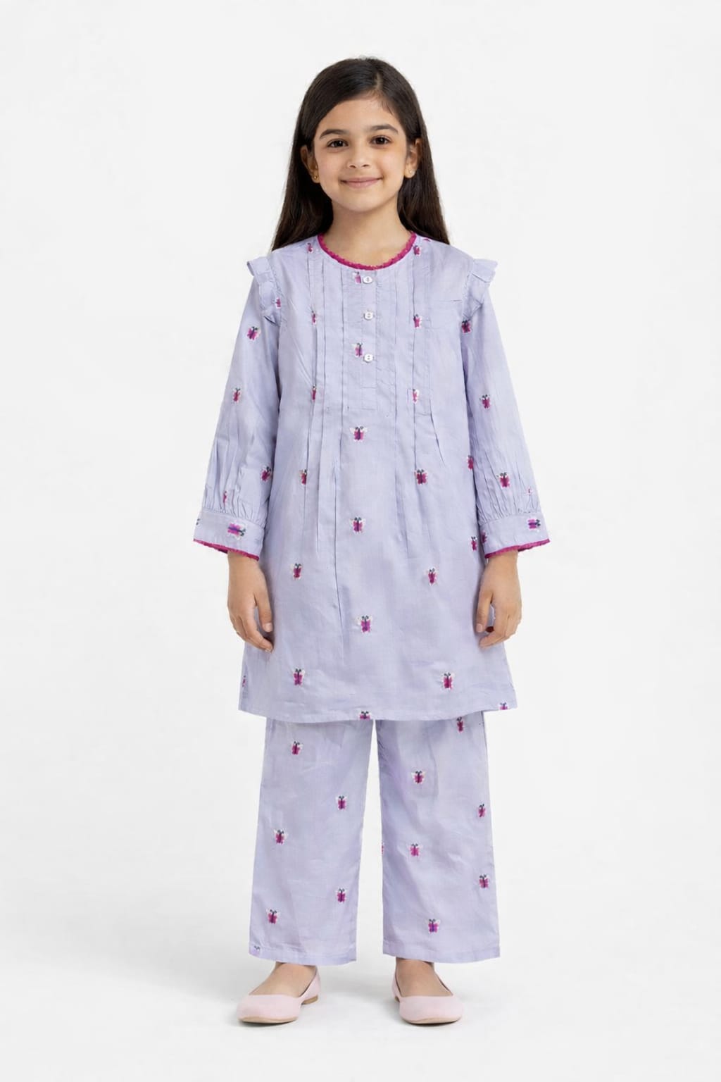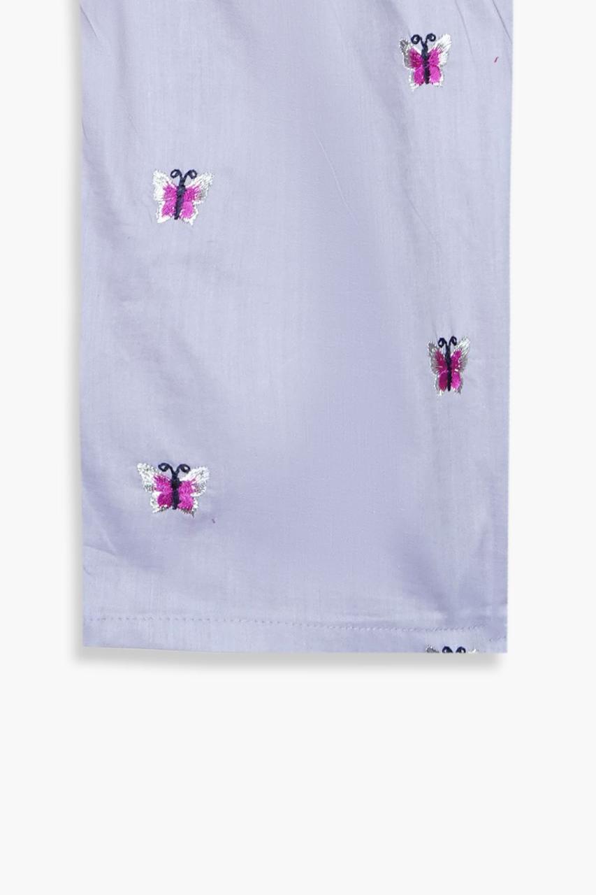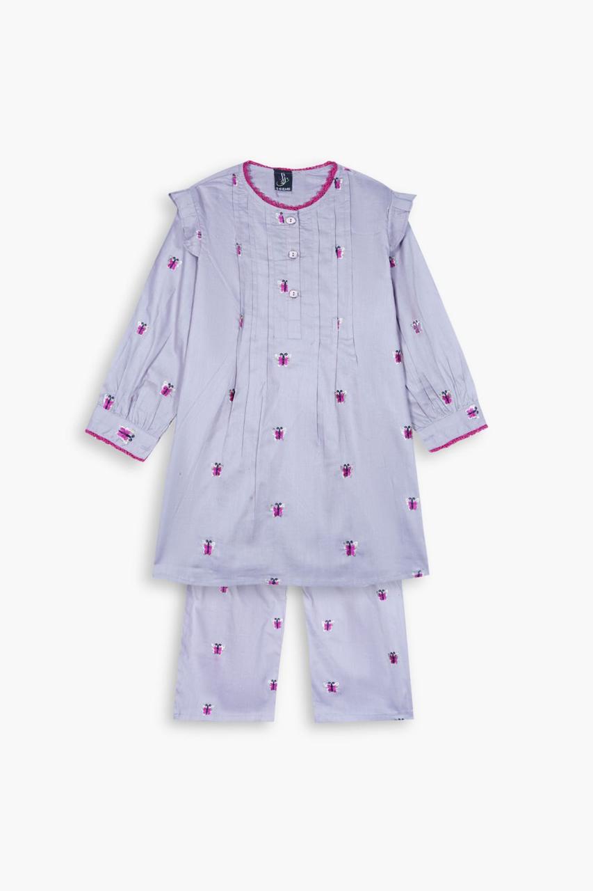 dd a touch of elegance to your little one’s wardrobe with this beautifully crafted girls 2-piece cotton suit, designed for comfort and timeless style. Made from 100% premium cotton, this outfit features all-over butterfly embroidery using delicate tilla work, giving it a graceful and festive appeal.