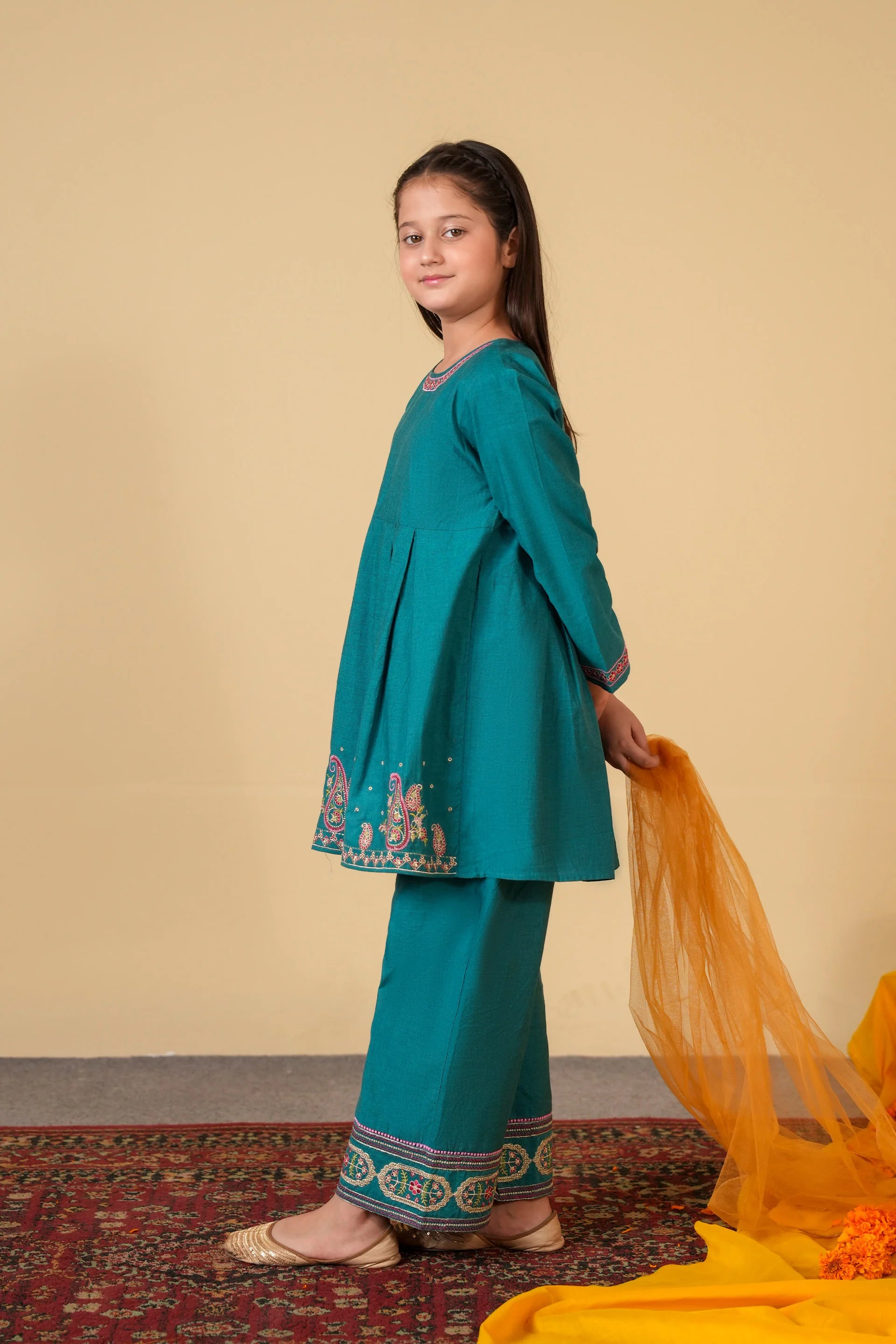 Keep your little one stylish and cozy this season with our girls’ embroidered 3-piece suit, crafted from 100% premium cotton specially designed for winter comfort. This elegant set includes an embroidered kurta, matching trousers, and a golden net dupatta that enhances the outfit with a festive touch.