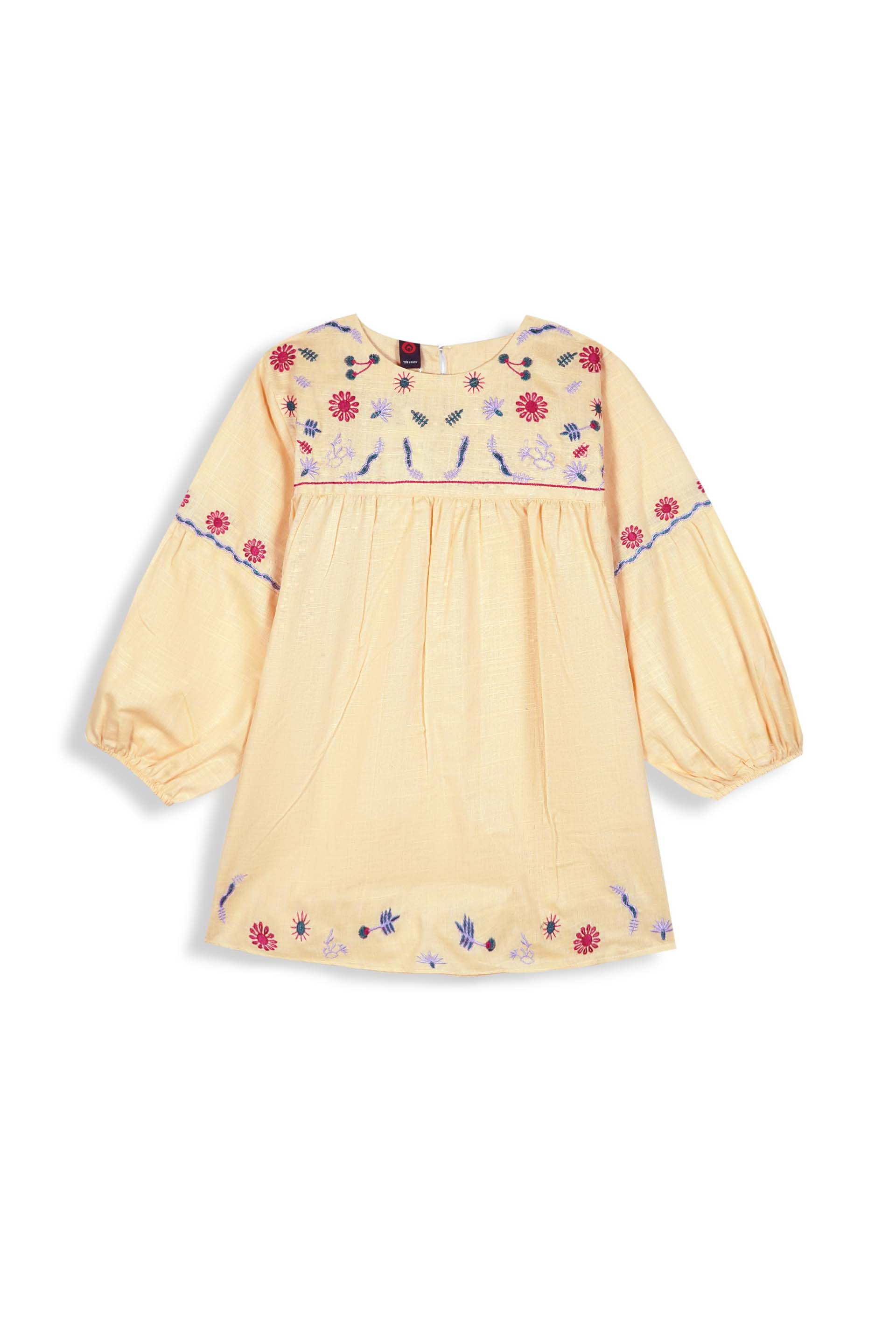 Multi-colored floral embroidery on yoke, sleeves, and hemline