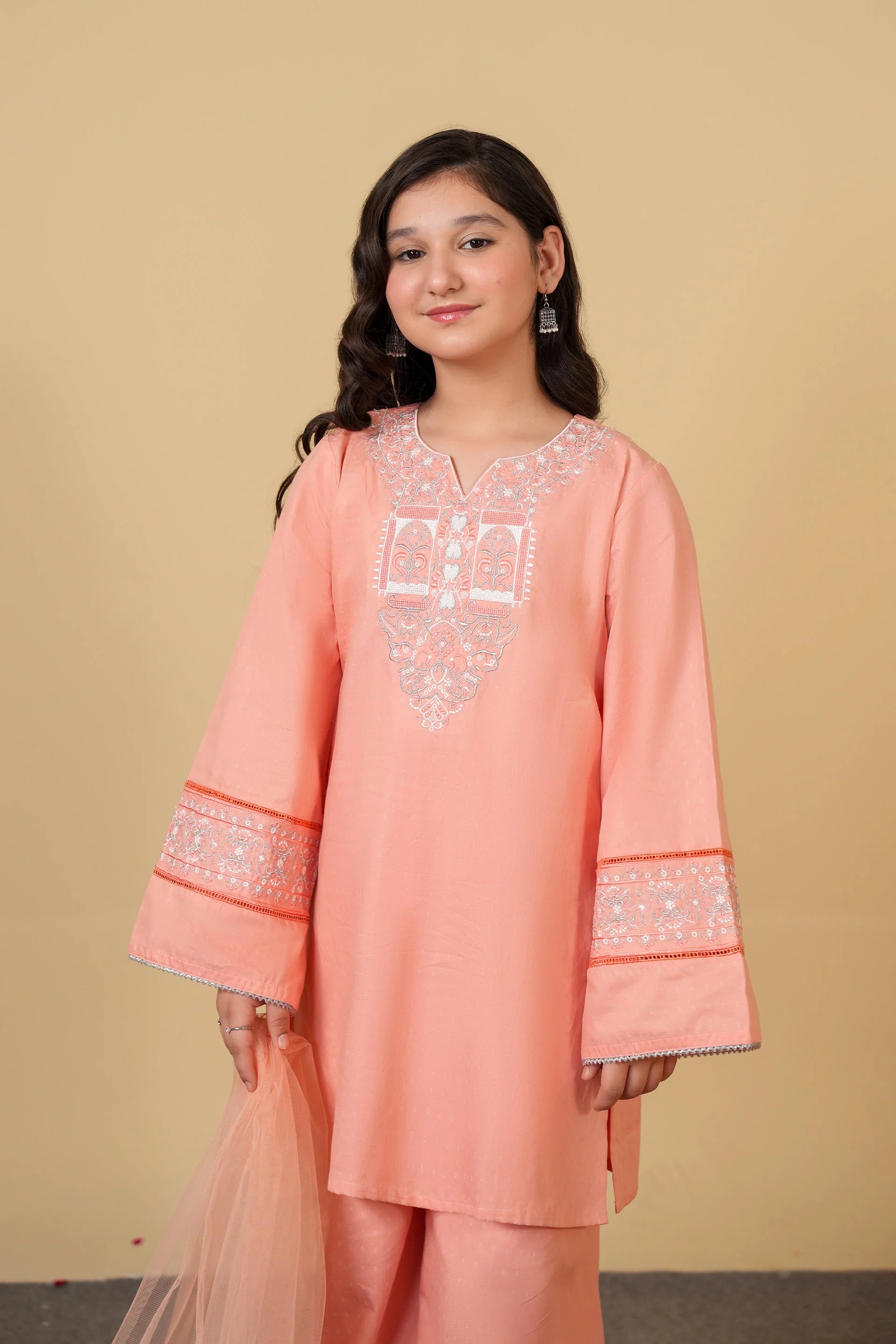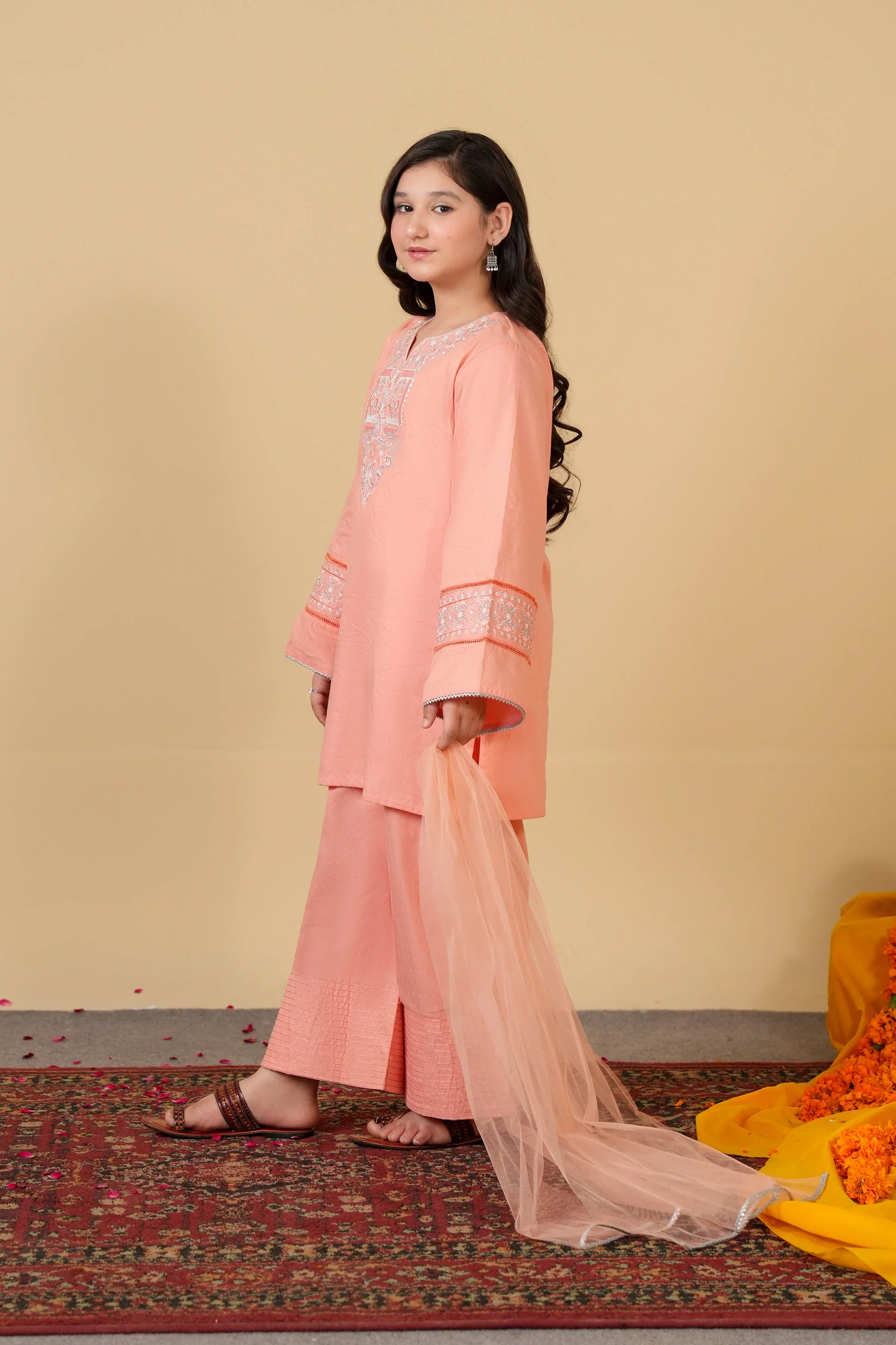 Elevate your child’s festive and casual wardrobe with this elegant girls’ Eastern wear set. Crafted from premium cotton fabric, this 3-piece suit features a beautifully embroidered kurta, matching trousers, and a soft net dupatta – perfect for family gatherings, Eid, and special occasions.