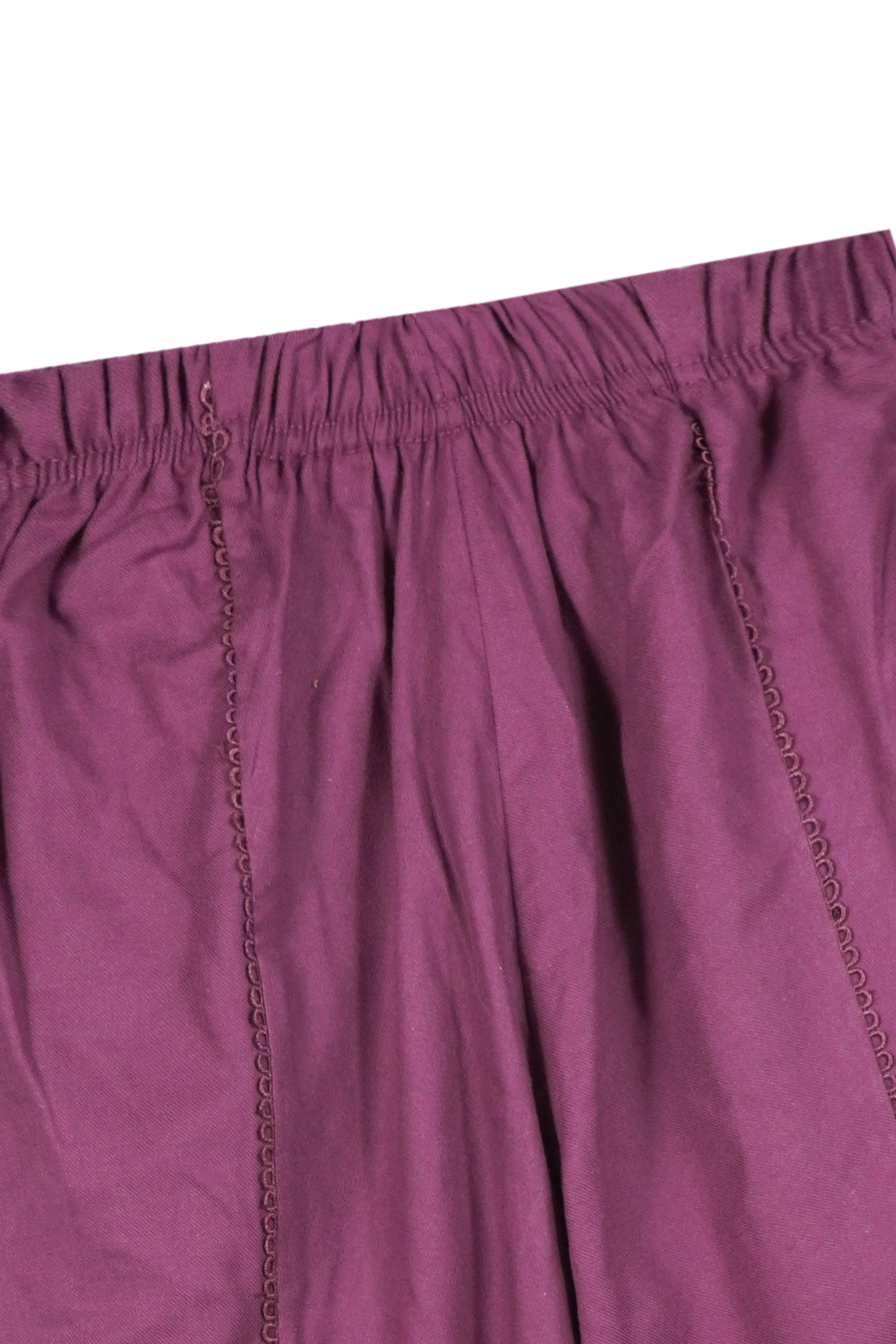 Elevate your little one’s festive winter wardrobe with this luxurious cambric cotton suit, designed for both warmth and elegance. The rich deep purple fabric is beautifully adorned with intricate gold tilla embroidery, adding a touch of timeless glamour to every detail—from the neckline to the sleeves and front panel.