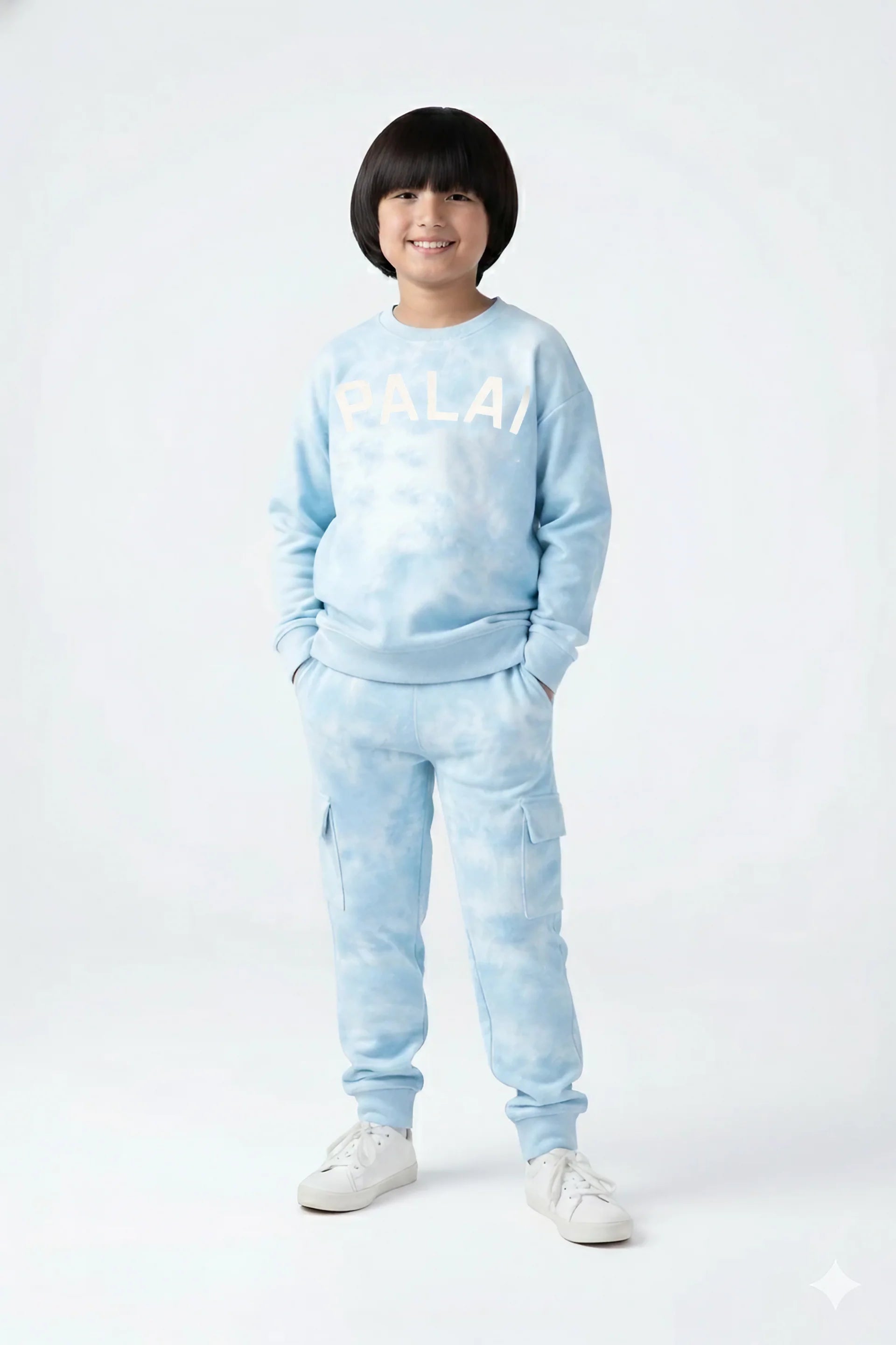 The trendy tie-dye design in soothing sky blue shades adds a cool and refreshing vibe, while the bold “PALAI” print on the sweatshirt gives it a sporty, fashionable edge. The jogger pants feature cargo-style side pockets and a stretchable waistband, ensuring both style and practicality.