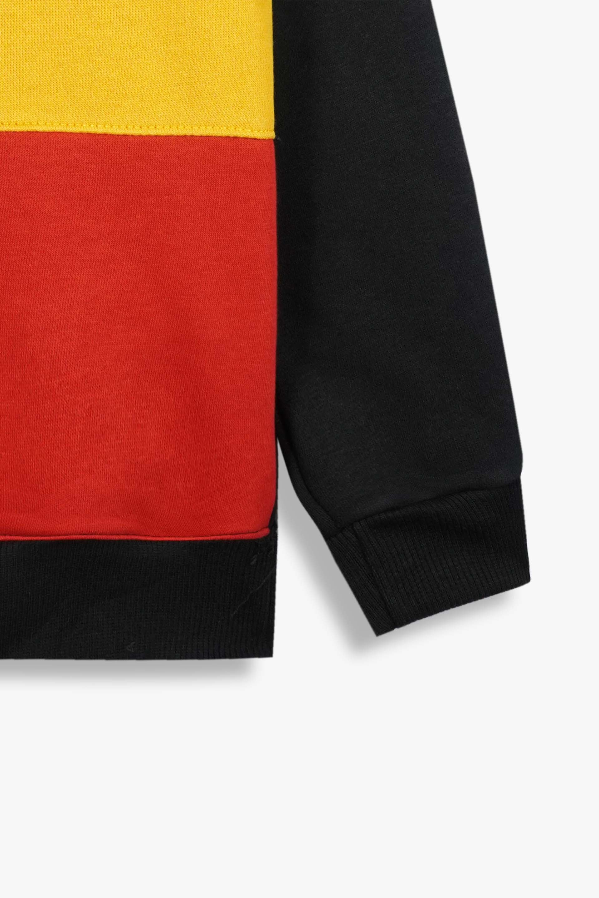 Keep your child warm and stylish with this premium 100% fleece hoodie, featuring a bold color-block design in classic black, vibrant mustard, and rich red. Made from soft, high-quality fleece, it provides excellent warmth and comfort, perfect for chilly days and active play.
