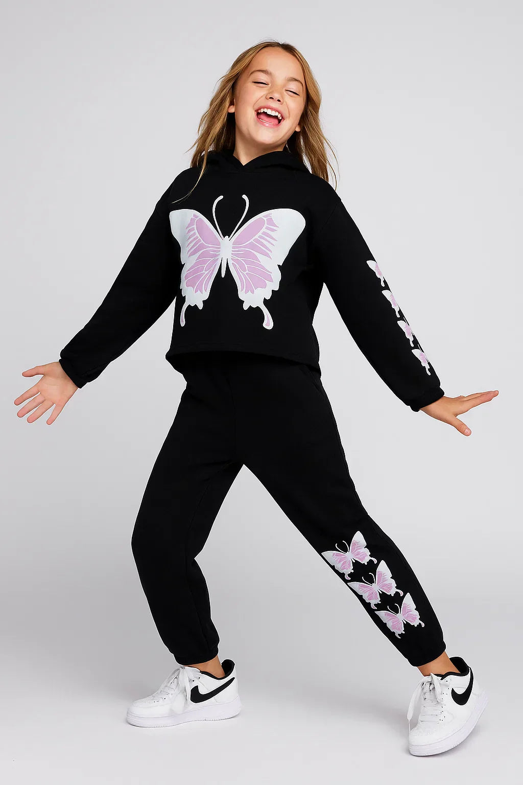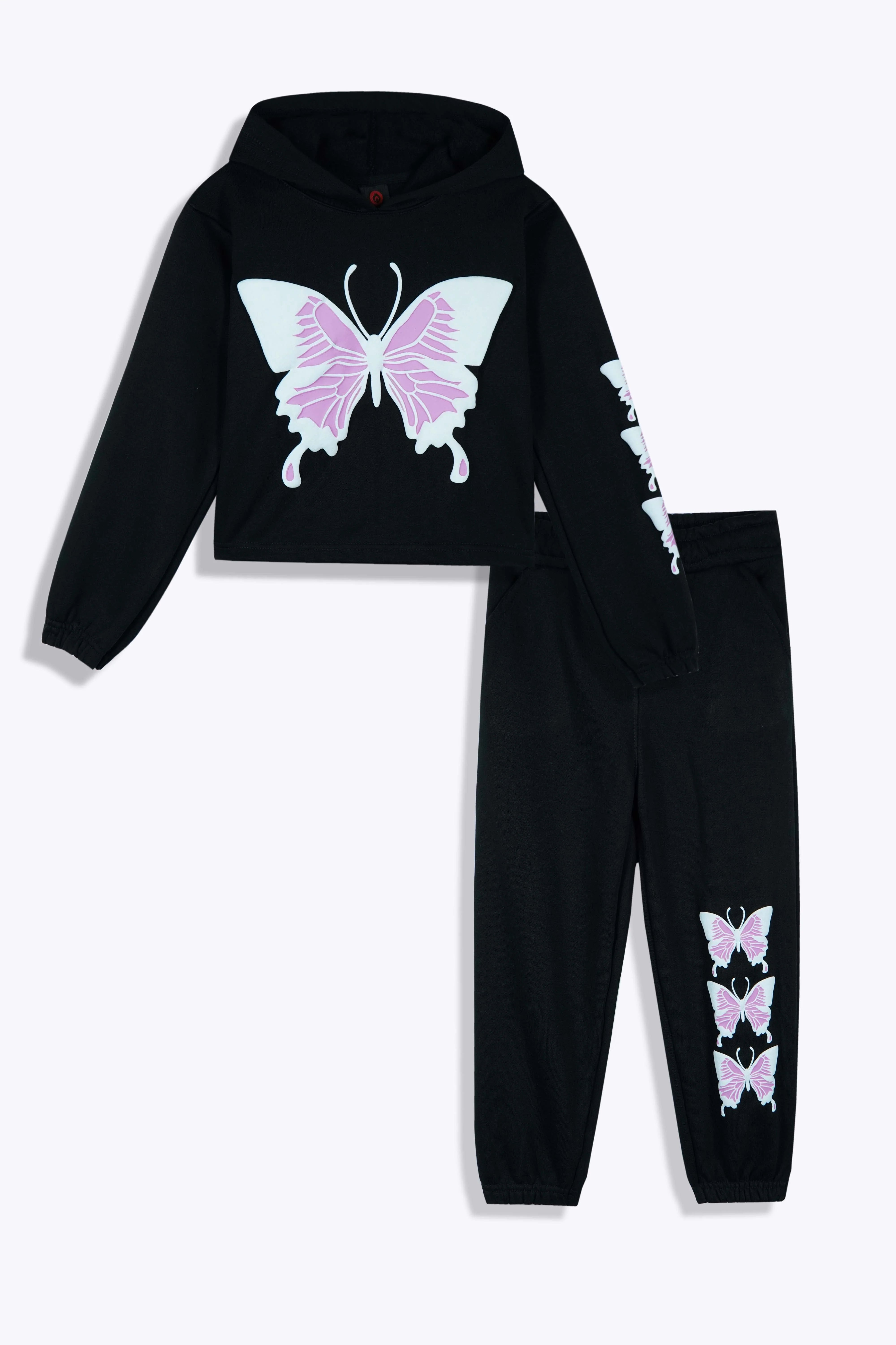 The cropped hoodie adds a playful twist with a bold front butterfly graphic and sleeve accents, while the matching jogger pants feature a trio of butterflies down the leg for a coordinated, stylish look. Perfect for cool days and chill vibes!