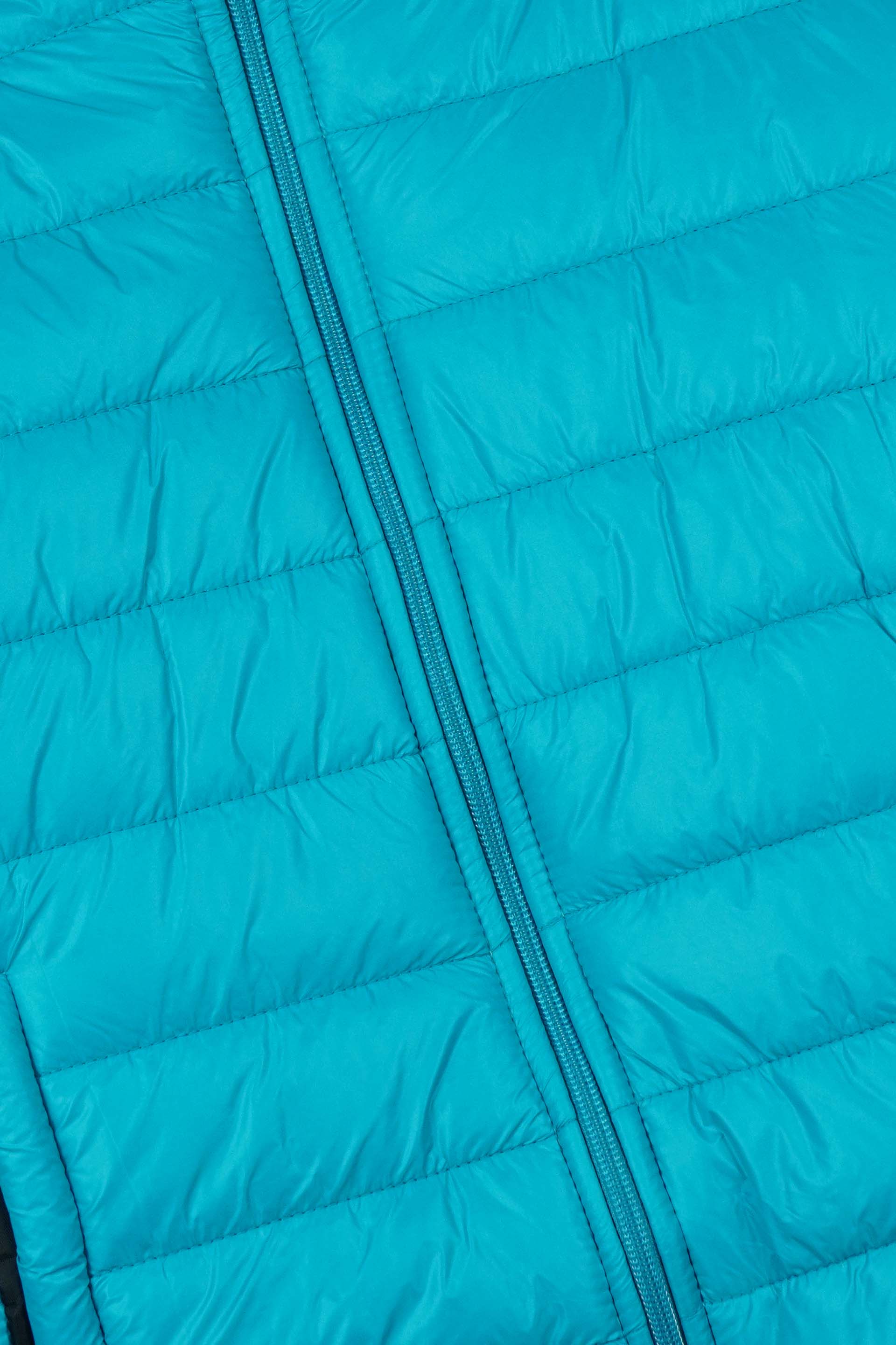The jacket features a vibrant turquoise color with a sleek black inner lining, front zipper closure, and quilted padding for extra insulation. Its protective hood and elastic cuffs block out chilly winds, while the side pockets add both style and functionality.