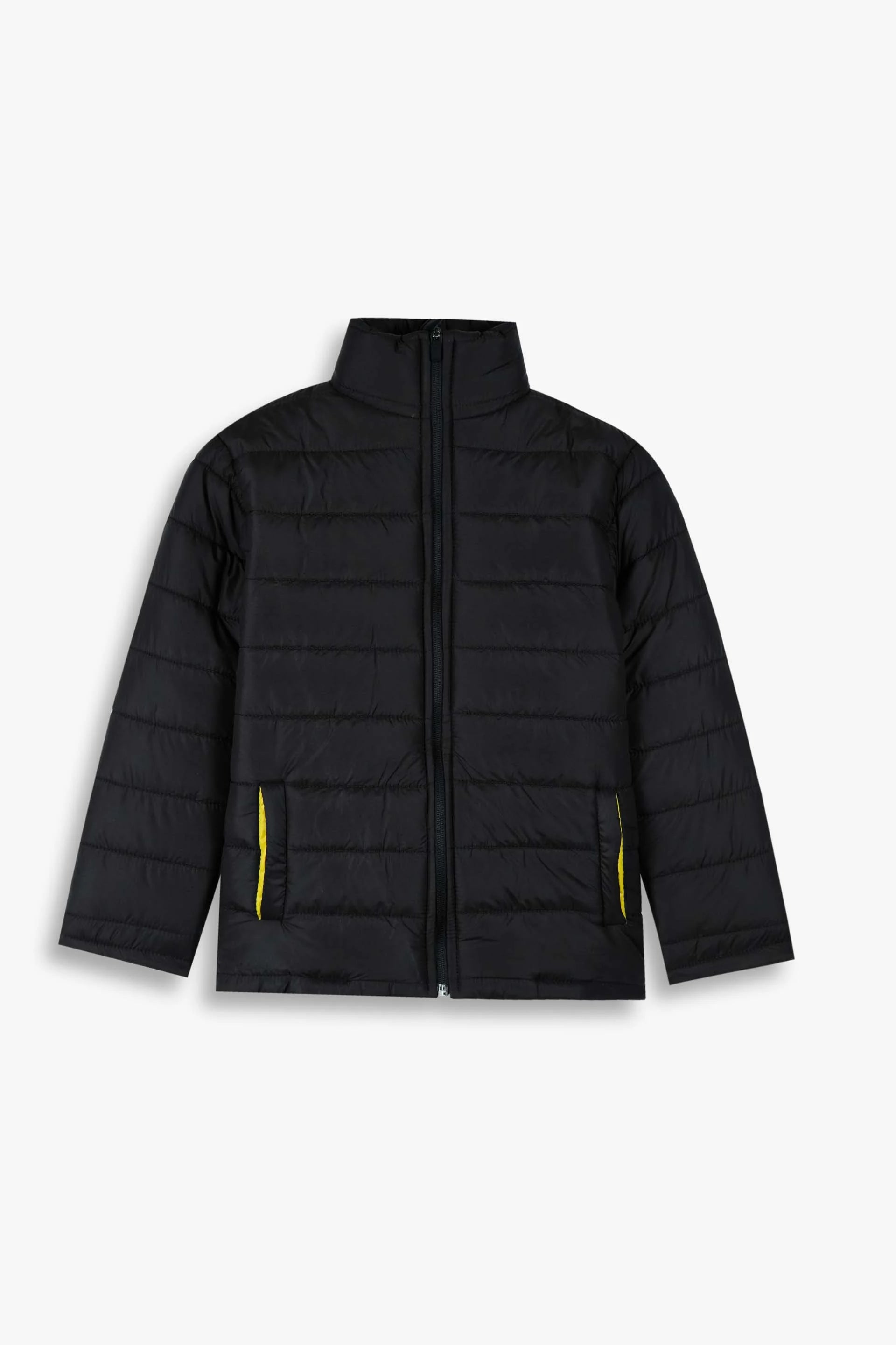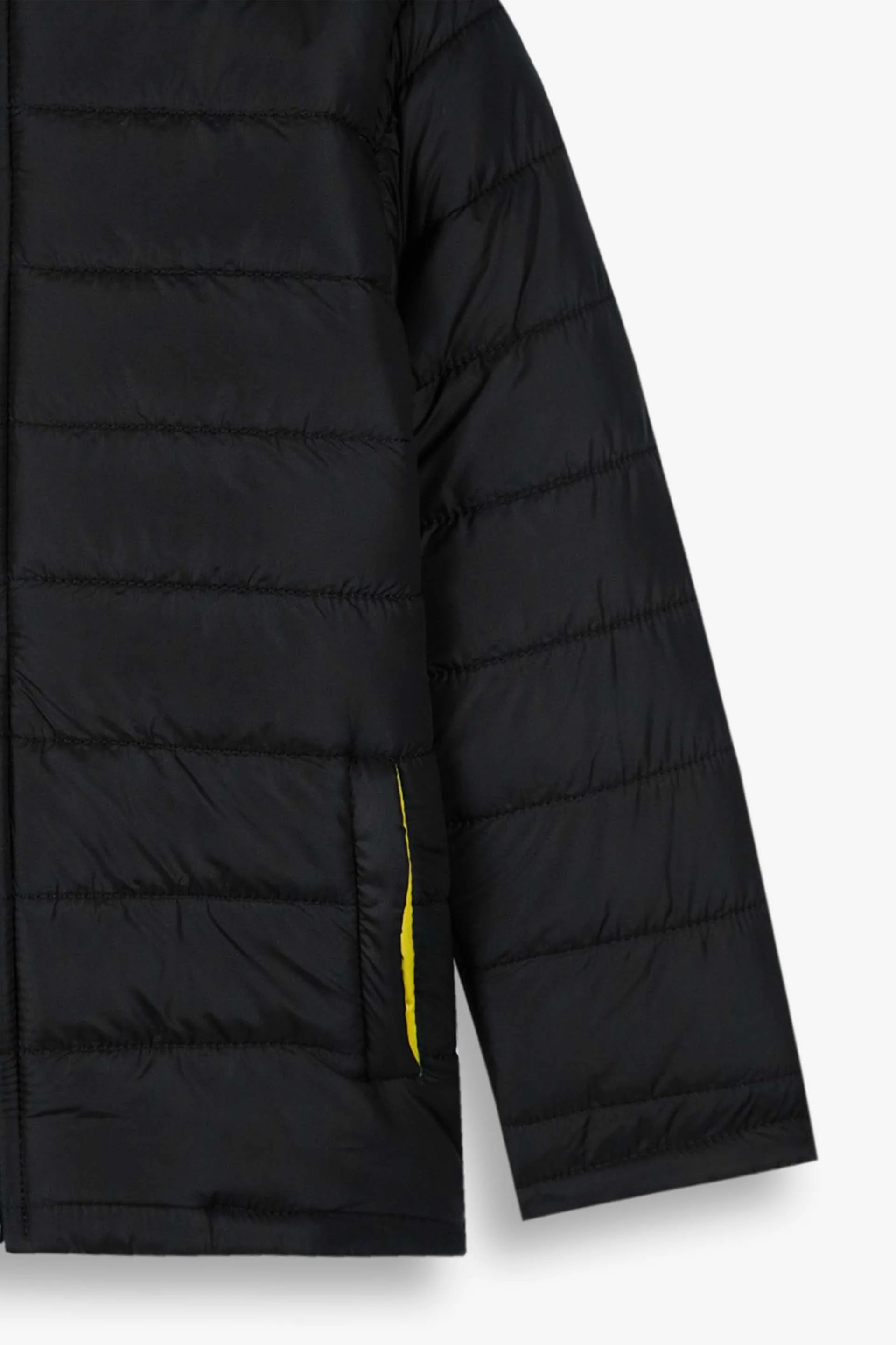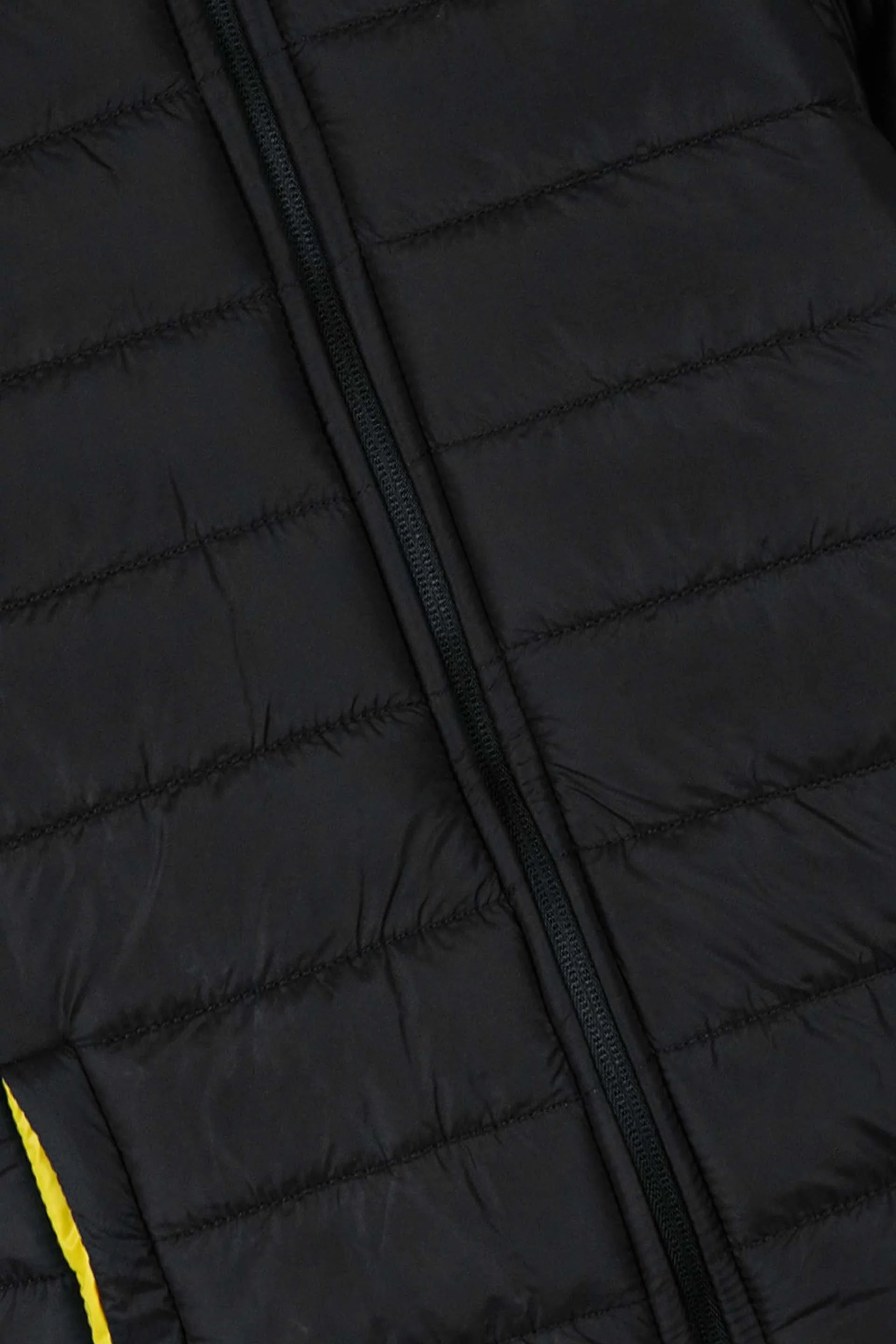 The sleek black design with subtle yellow pocket accents adds a modern touch, while the front zipper closure and high-neck collar ensure complete protection against cold winds. Its quilted padding offers insulation and comfort, making it an ideal outerwear choice for pre-winter and harsh winter conditions.