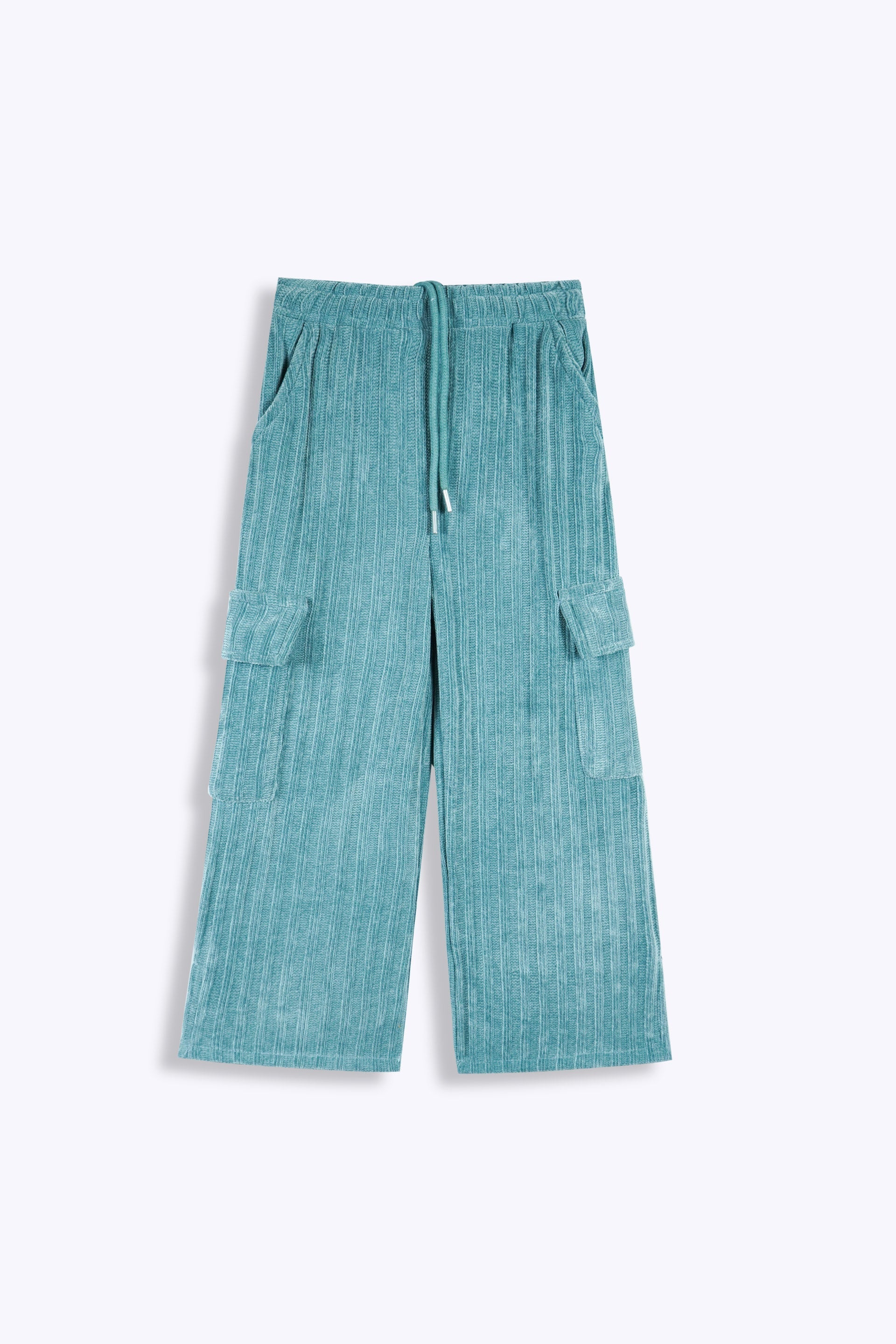 Add a luxe touch to your child’s wardrobe with this ultra-soft velour tracksuit in a rich teal tone. Crafted from plush ribbed velour fabric, this two-piece set includes a relaxed-fit hoodie and matching wide-leg cargo pants, combining comfort with elevated style.