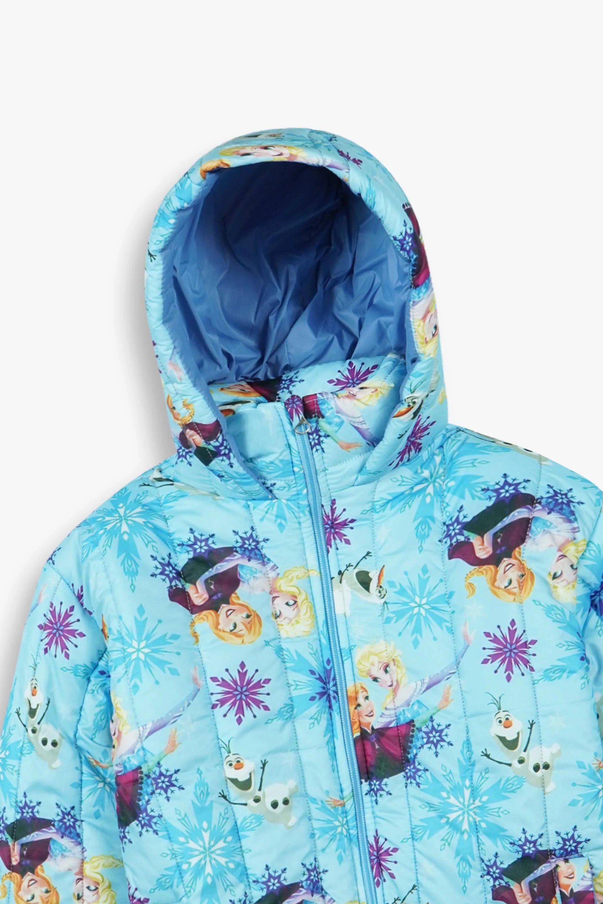 Designed for comfort and warmth, the jacket includes a full front zipper closure, padded quilting for insulation, and a protective hood to shield against cold winds. The bright Frozen-inspired design makes it a favorite pick for kids who love Disney characters, while the durable fabric ensures long-lasting wear.
