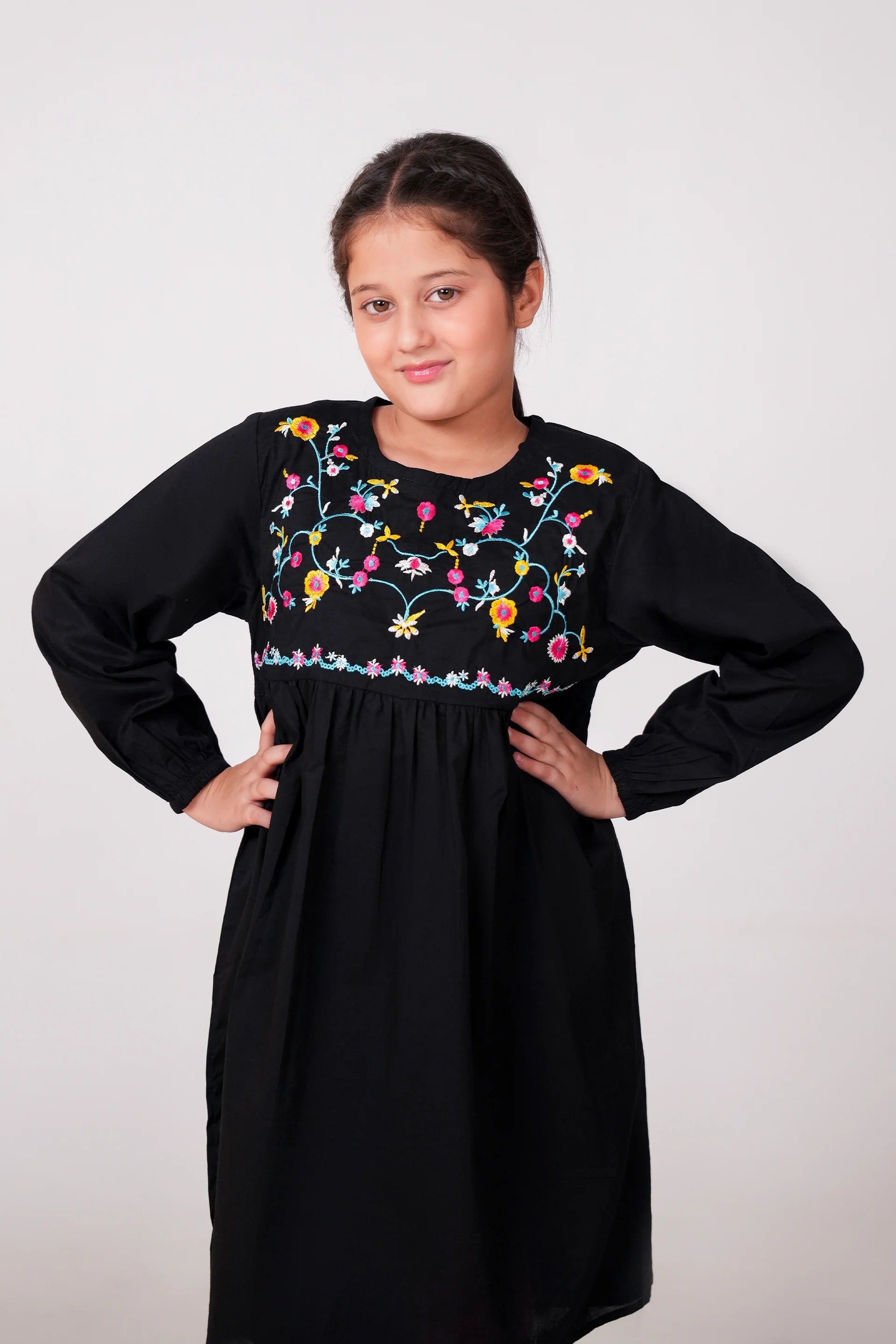 Crafted from premium breathable cotton, this top is soft on delicate skin and perfect for all-day comfort. The front yoke showcases colorful floral embroidery in bright hues of yellow, pink, and blue—expertly created with high-precision multi-head embroidery technology for a neat, durable finish that retains its brilliance wash after wash.